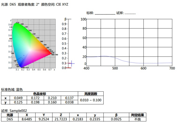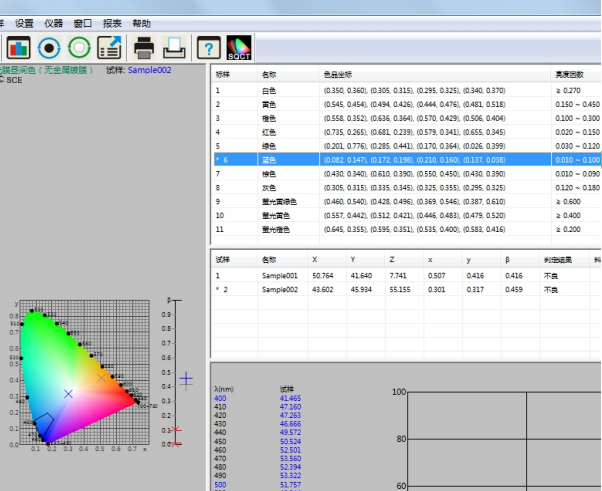 譬如如何判定藍(lán)色試樣是否在《GB/T?18833-2012道路交通反光膜樣》所規(guī)定的藍(lán)色區(qū)域內(nèi)(無金屬鍍層,晝間反光膜顏色),按照下面的步驟,將依次完成測量和判定。