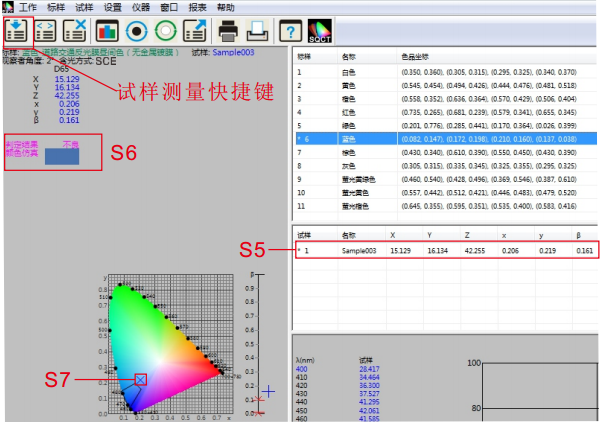 將測試樣品放在NS808測量口徑上,貼緊,鼠標(biāo)點(diǎn)擊試樣測試快捷工具,如圖13所示。大約1.5秒時(shí)間,完成測試,測試數(shù)據(jù)如圖13中S5所示,在色品坐圖中的位置如S7所示,仿真及判定結(jié)果如S6部分所示。