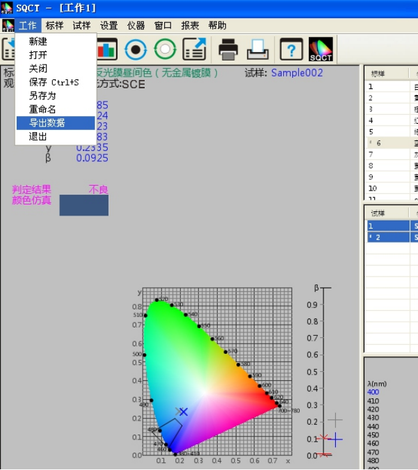 SQCT直接將《GB/T?18833-2012道路交通反光膜樣》的多邊形顏色區(qū)域做入軟件中,可以直接從菜單中選擇,“標(biāo)樣->道路交通反光膜GB/T?18833->晝間色(無金屬鍍膜)”如圖11所示。