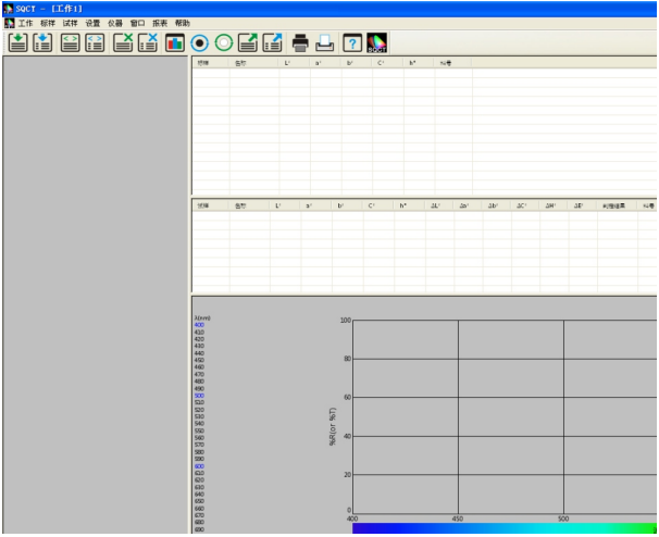 NS808的交通路標(biāo)測試模塊主要是通過上位機(jī)軟件SQCT配合NS808儀器實(shí)現(xiàn)的。使用前需先安裝好SQCT上位機(jī)軟件,再連接NS808儀器,然后打開上位機(jī)軟件,默認(rèn)為普通測試界面,如圖1所示,在該界面下可以完成CIE?L*a*b、XYZ、ΔE*ab、ΔE*cmc、ΔE*00等色度數(shù)據(jù)的測試,詳細(xì)菜單和工具欄的介紹請參照該軟件自帶“色彩管理控制軟件使用說明書”,這里重點(diǎn)介紹交通路標(biāo)測試模塊。