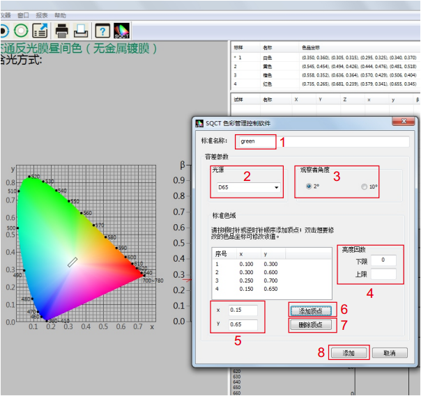 如圖5所示,在位置1處輸入標(biāo)樣名稱,位置2處選擇光源種類(默認(rèn)為D65),位置3處選擇觀察者角度(默認(rèn)為2度),位置4處輸入亮度因數(shù)(除熒光物質(zhì)外,普通反射樣品亮度因數(shù)大于0小于1,即0<β<1)。在位置5處輸入色品坐標(biāo)點(diǎn),然后點(diǎn)擊“添加頂點(diǎn)”按鈕,則新輸入的色品坐標(biāo)點(diǎn)出現(xiàn)在標(biāo)準(zhǔn)色域框內(nèi),重復(fù)上述步驟,依次輸入各色品坐標(biāo)點(diǎn);對于輸入錯(cuò)誤的色品坐標(biāo)點(diǎn),先在標(biāo)準(zhǔn)色域框內(nèi)選中,然后點(diǎn)擊“刪除頂點(diǎn)”按鈕,則刪掉該頂點(diǎn)。全部輸入完畢,點(diǎn)擊位置8處“添加”按鈕,則完成“多邊形-容差標(biāo)樣”建立。