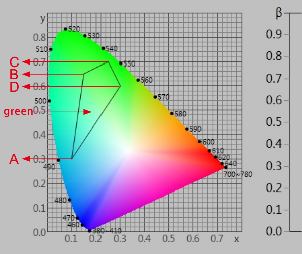 在《GB?2893安全色》、《GB/T?18833道路交通反光膜》等相關(guān)標(biāo)準(zhǔn)中,通常給出一塊顏色區(qū)域(多個(gè)色品坐標(biāo)點(diǎn))和亮度因數(shù)要求,在D65/A光源和45/0幾何條件下,判定樣品是否落在對應(yīng)的顏色區(qū)域內(nèi),借此判定樣品是否滿足標(biāo)準(zhǔn)規(guī)定的色度要求。由于顏色區(qū)域?yàn)槎噙呅?,如下圖所示,導(dǎo)致使用普通的分光測色儀無法完成判定。NS808測色儀配合SQCT軟件的交通路標(biāo)測量模塊則可以輕松解決這方面的問題。