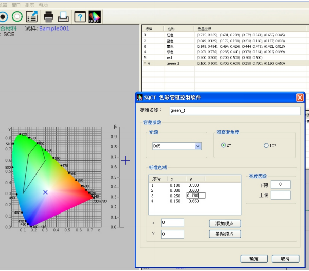 如圖7所示,修改上面建立的名稱為“green”的多邊形-容差標(biāo)樣,先選中該標(biāo)準(zhǔn),然后可?以修改“標(biāo)準(zhǔn)名稱”“光源”“?標(biāo)準(zhǔn)觀察者角度”“亮度因數(shù)”“色品坐標(biāo)”,修改完畢,點(diǎn)擊“確定”按鈕,則修改生效。