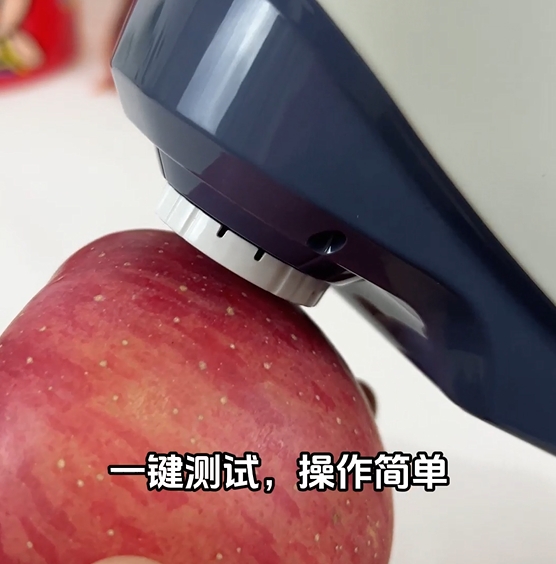 4、設(shè)置完成后,按確認鍵退出,然后進入標樣測量,按測量鍵,先影像定位測量區(qū)域,將待測蘋果的標樣對準測試孔,注意避免人為因素的影響,再按開始鍵,完成測量后查看測試結(jié)果。